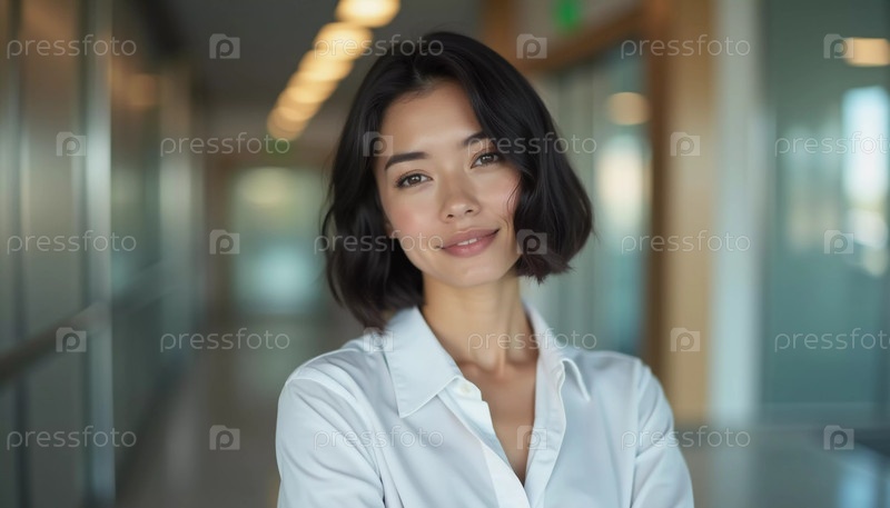 Молодой профессионал в белой рубашке стоит, демонстрируя теплую улыбку в современной офисной обстановке, наполненной мягким рассеянным светом. Симпатичная азиатская брюнетка со стрижкой боб. Генеративный ИИ