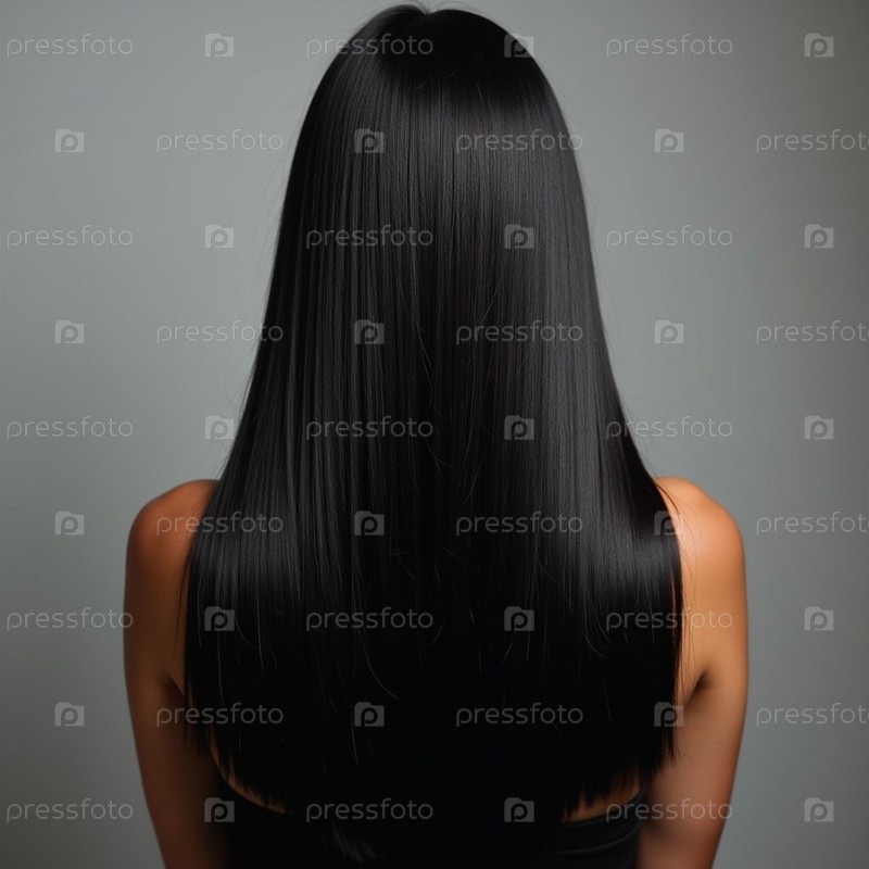 Гладкие, прямые черные волосы элегантно протекают по спине, подчеркивая их здоровый блеск и равномерный цвет, освещенные мягким освещением, создавая эффектный вид