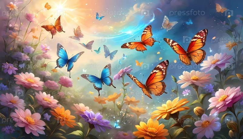 Красочные бабочки грациозно танцуют среди множества цветущих цветов, освещенных теплым светом восхода солнца, создавая умиротворяющую атмосферу сада. Генеративный ИИ
