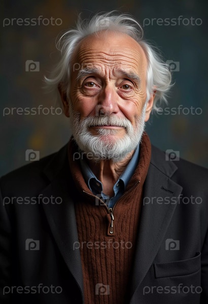 Пожилой мужчина стоит уверенно, одетый в черную куртку. Мягко освещенный фон. Портрет русского мужчины, 60-70-80 лет. Серьезное, мудрое, вдумчивое лицо. Пенсионер с седыми волосами. Генеративный ИИ