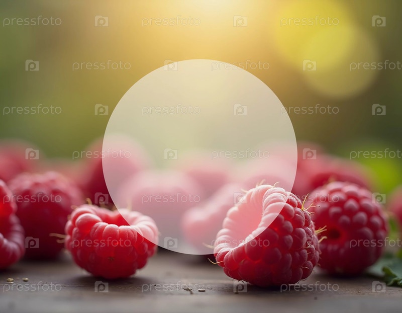Зрелые ягоды малины представлены на округлом полупрозрачном фоне и с мягким эффектом боке, создающим мечтательную атмосферу.Упаковка для чая, джема или косметики с ароматом малины