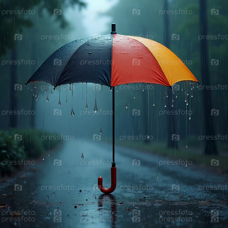Яркий зонтик стоит на мокрой тропинке, окруженной высокими деревьями, а капли дождя падают с его краев, передавая суть дождливого дня на природе. Генеративный ИИ