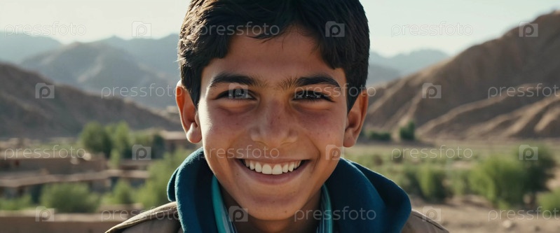Веселый мальчик лет 10-15 широко улыбается на фоне потрясающего афганского пейзажа. На заднем плане горы и зеленая растительность, демонстрирующая его живой дух. Генеративный ИИ