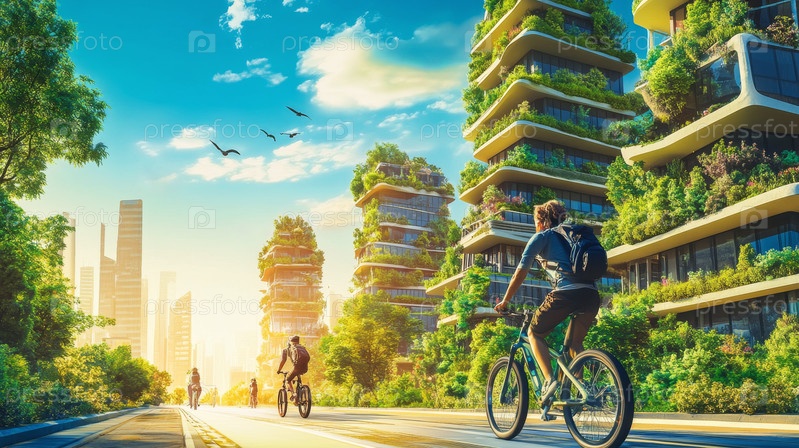 На этом снимке запечатлена гармония природы и городской жизни: велосипедисты наслаждаются поездкой среди инновационных, экологически чистых зеленых зданий под солнечным небом, пропагандируя яркий, устойчивый образ жизни