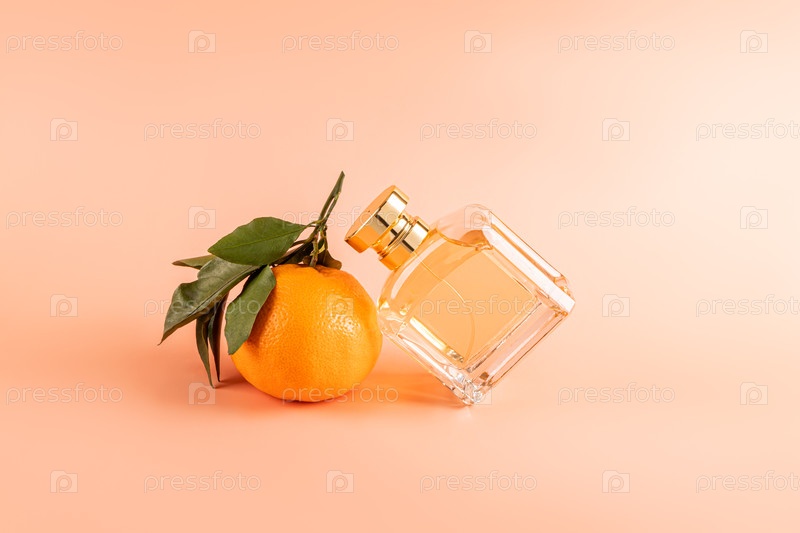 Небрендовый флакон духов с запахом цитрусовых нот опирался на спелый апельсиновый мандарин. женская и мужская эссенция. Вид спереди