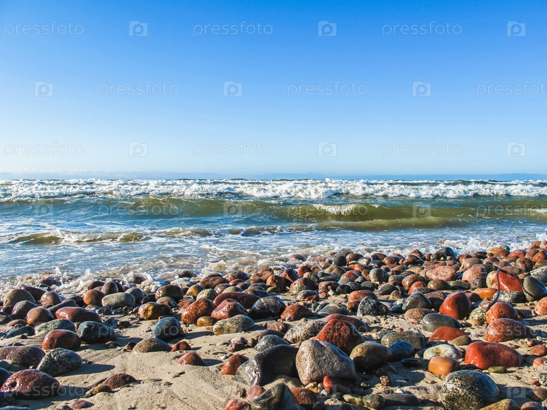 Камни лежат на песчаном пляже у моря под летним солнцем