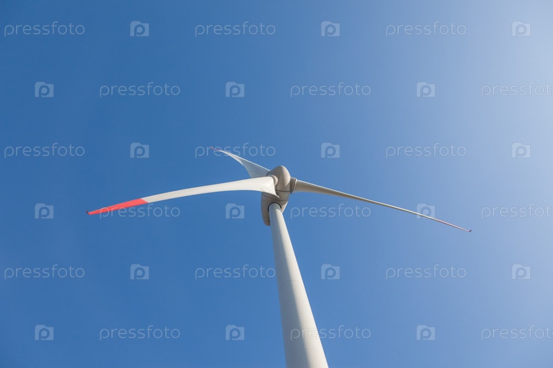 Ветряная турбина с солнечными бликами на фоне голубого неба, вид снизу