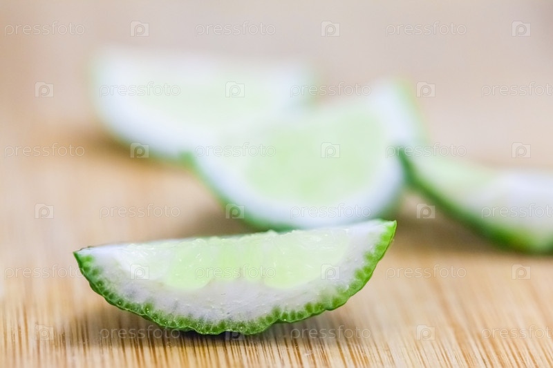 Ломтики лайма на деревянном столе, крупный план размытого фона