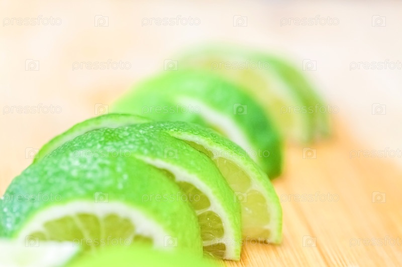 Ломтики лайма на деревянном столе, крупный план размытого фона