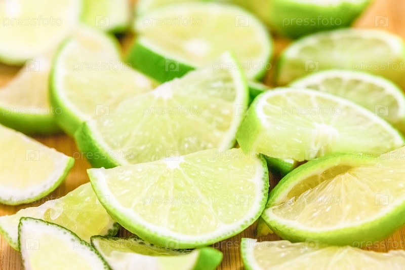 Ломтики лайма на деревянном столе, крупный план размытого фона