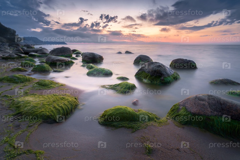 Скалистый берег моря, на заднем плане яркий оранжевый закат