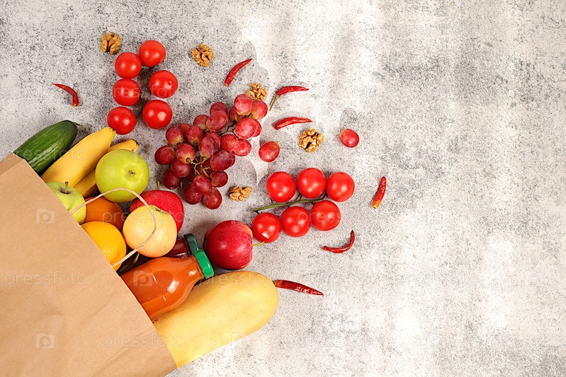 Бумажный эко-мешок со здоровыми веганскими продуктами для похудения. Виноград, апельсины, помидоры, яблоки, бананы и натуральный сок в крафт-мешке на бетонном фоне, концепция доставки еды, реклама магазина