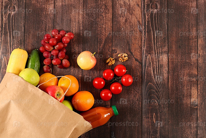 Виноград, апельсины, помидоры, яблоки, бананы и натуральный сок в крафт-пакете на деревянном фоне, концепция доставки еды, Бумажный эко-пакет со здоровыми веганскими продуктами для похудения. Реклама магазина