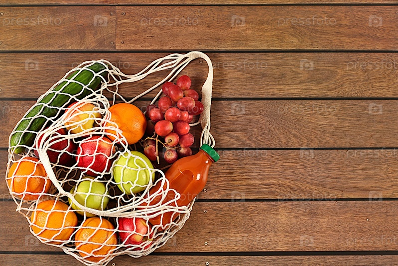 Тканевая сумка для покупок с различными веганскими продуктами для похудения. Виноград, апельсины, помидоры, яблоки, бананы и натуральный сок в хлопковой сумке на деревянном фоне, концепция доставки еды, реклама магазина