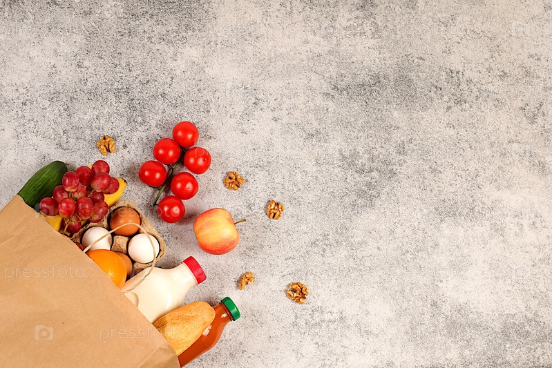 Бумажный пакет с различными натуральными продуктами. Молоко, яйца, багеты, натуральный сок, овощи и фрукты в пакете с застежкой-молнией на бетонном фоне, концепция доставки еды, реклама магазина