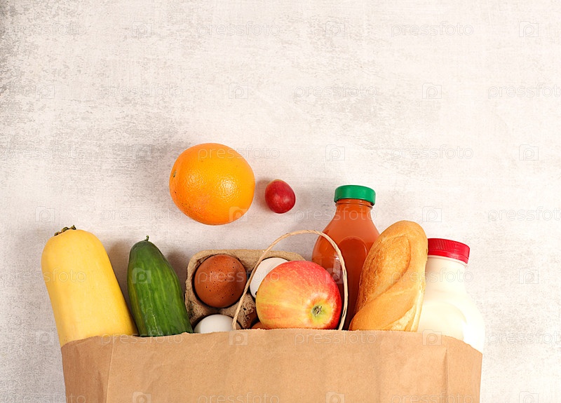 Бумажный пакет с различными натуральными продуктами. Молоко, яйца, багеты, натуральный сок, овощи и фрукты в пакете с застежкой-молнией на бетонном фоне, концепция доставки еды, реклама магазина
