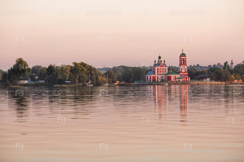Золотое кольцо России, город Переславль-Залесский. Церковь Сорока мучеников Севастийских на красивом розовом закате на берегу Плещеева озера