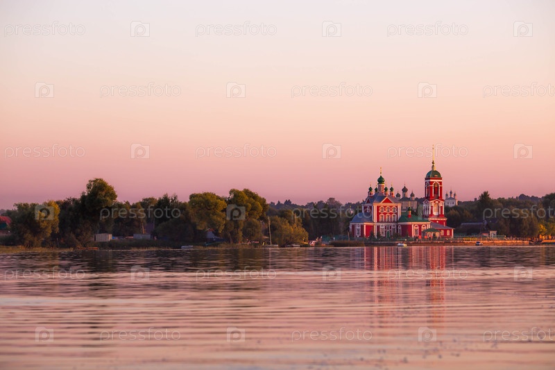 Золотое кольцо России, город Переславль-Залесский. Церковь Сорока мучеников Севастийских на красивом розовом закате на берегу Плещеева озера