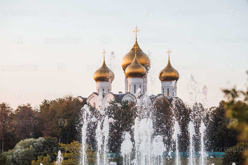 Россия, город Ярославль. Спасо-Преображенский монастырь, Успенский собор, вид со смотровой площадки, через фонтан, Золотое кольцо