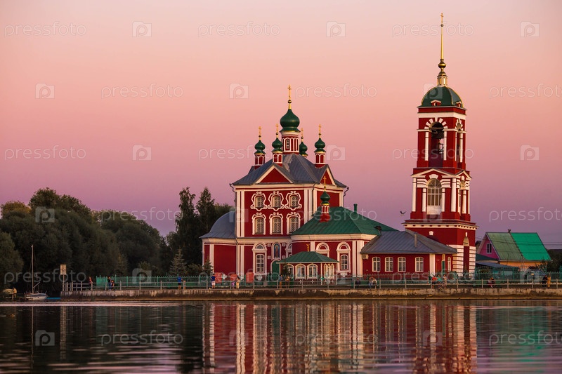 Золотое кольцо России, город Переславль-Залесский. Церковь Сорока мучеников Севастийских на красивом розовом закате на берегу Плещеева озера
