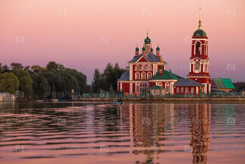 Золотое кольцо России, город Переславль-Залесский. Церковь Сорока мучеников Севастийских на красивом розовом закате на берегу Плещеева озера