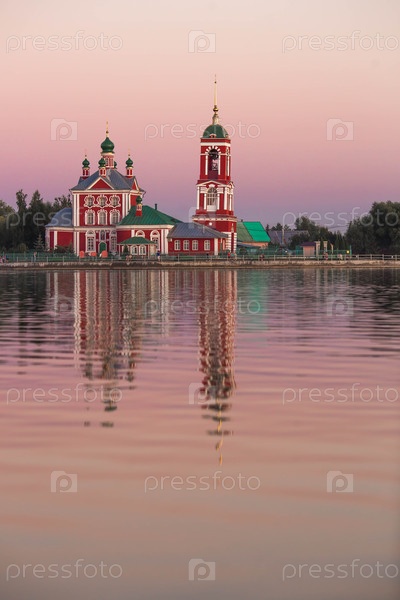 Золотое кольцо России, город Переславль-Залесский. Церковь Сорока мучеников Севастийских на красивом розовом закате на берегу Плещеева озера