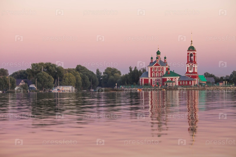 Золотое кольцо России, город Переславль-Залесский. Церковь Сорока мучеников Севастийских на красивом розовом закате на берегу Плещеева озера