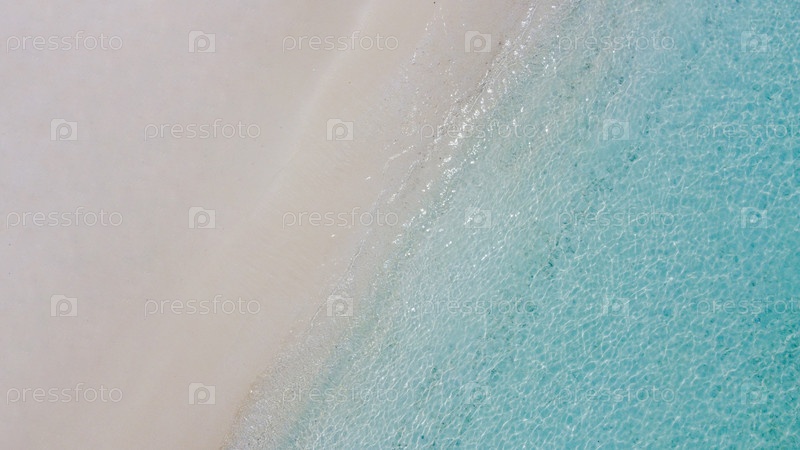 Вид с воздуха на пляж и голубую морскую воду. Красивый морской пейзаж. Спокойные океанские волны и чистый песок. Отдых, релаксация и отпуск