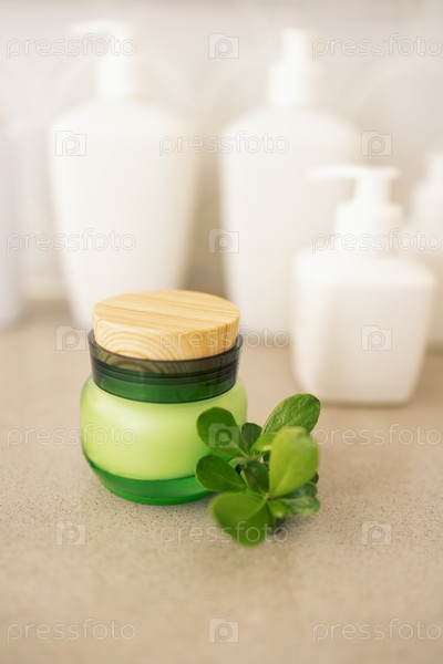 Крупный план банки зеленого стеклянного крема с деревянной крышкой и веточкой с листьями. Макет косметического продукта на столе