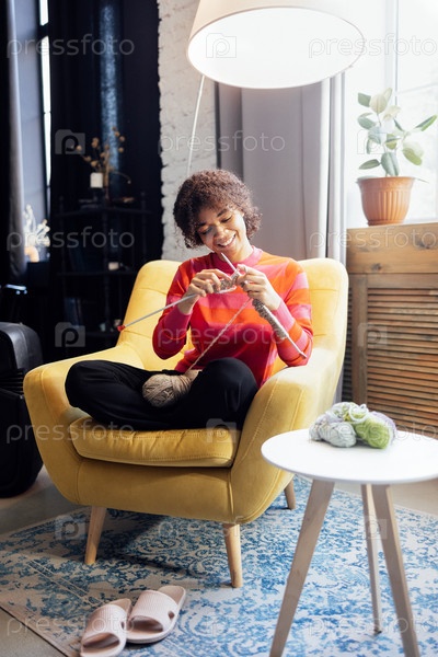Молодой африканец улыбается и вяжет дома в гостиной. Черная девочка в повседневной одежде занимается рукоделием. Счастливая женщина сидит в кресле и держит спицы и пряжу