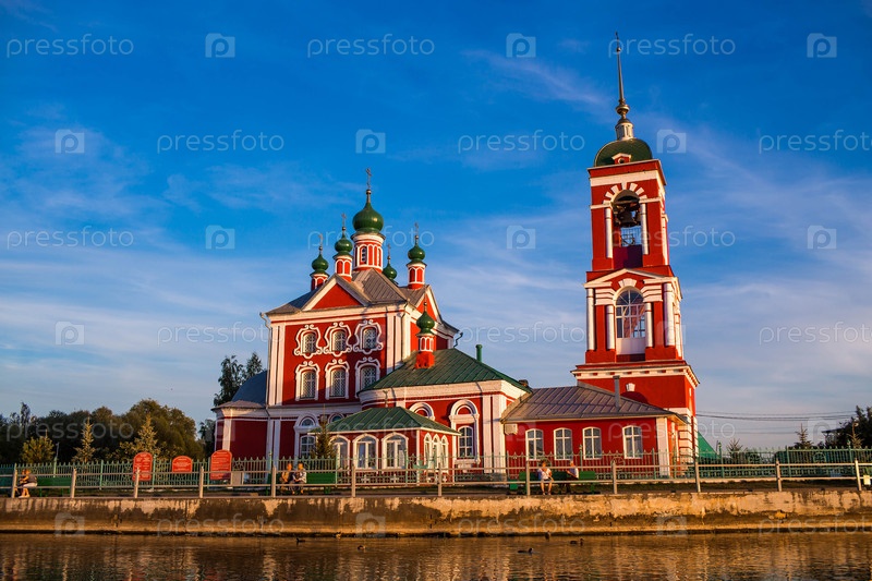 Золотое кольцо России, город Переславль-Залесский. Церковь Сорока Севастийских мучеников отражается на закате в Плещеевом озере