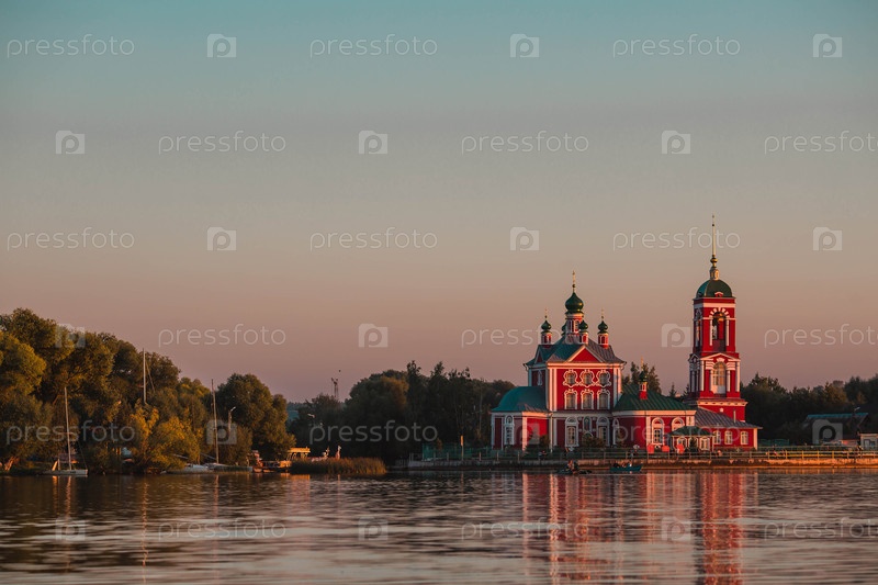 Золотое кольцо России, город Переславль-Залесский. Церковь Сорока мучеников Севастийских на красивом розовом закате на берегу Плещеева озера