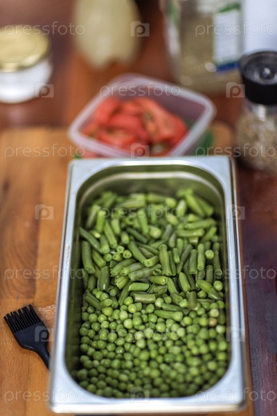 Готовим полезное вегетарианское блюдо. Металлическая миска со свежим зеленым горошком на деревянном столе. Ингредиенты для вкусного обеда