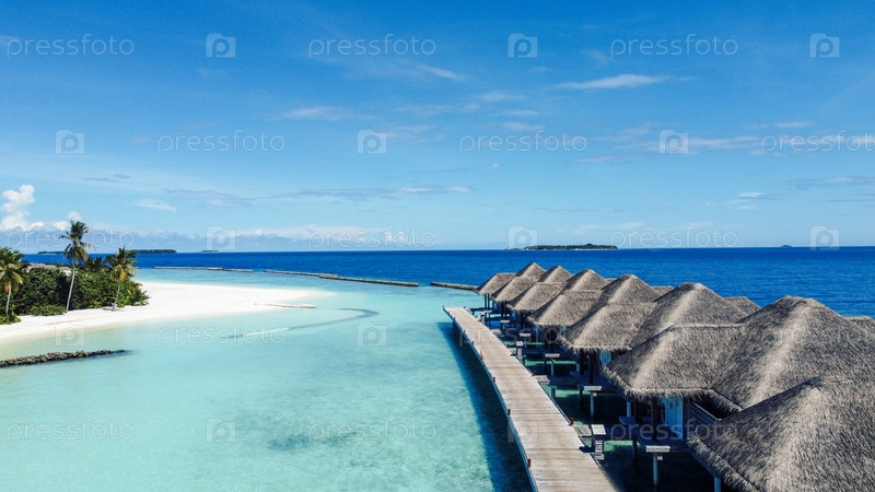 Вид с воздуха на роскошные виллы над водой с соломенными крышами