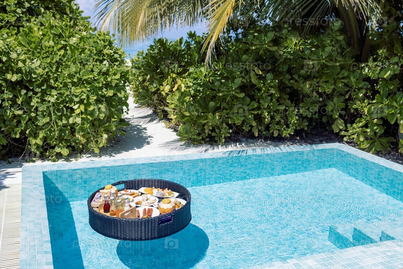 В роскошном бассейне находится плавающий поднос для завтрака с различными блюдами и напитками