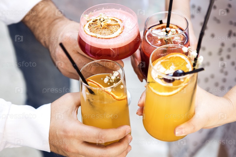 Крупный план мужских и женских рук с элегантными бокалами. Мужчины и женщины произносят тосты с бокалами красочных коктейлей. Друзья чокаются бокалами с вкусными напитками