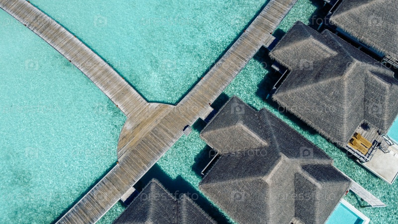 Вид с воздуха на роскошные виллы над водой с соломенными крышами. Дома окружены чистой бирюзовой водой. Деревянные дорожки соединяют бунгало