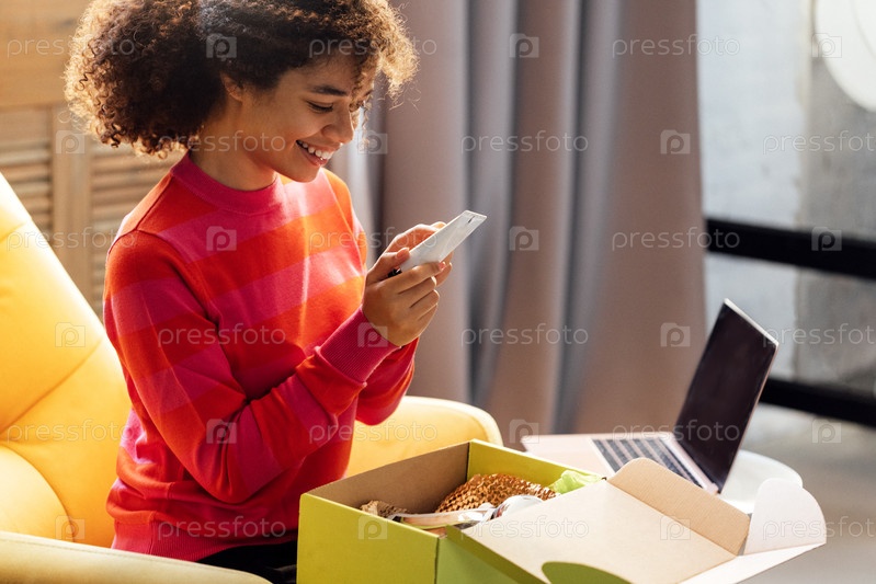 Молодая привлекательная африканка в повседневной одежде распаковывает коробку с косметическими средствами. Очаровательная чернокожая девушка улыбается и держит крем для лица