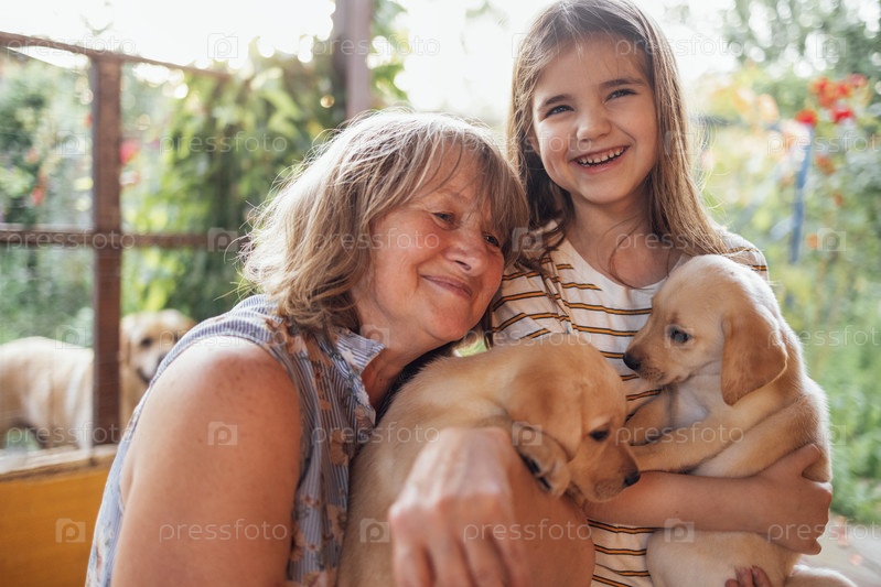 Зрелая женщина обнимает щенков и внучку. Улыбающаяся маленькая девочка держит лабрадора. Милый ребенок с бабушкой заботится о домашних животных