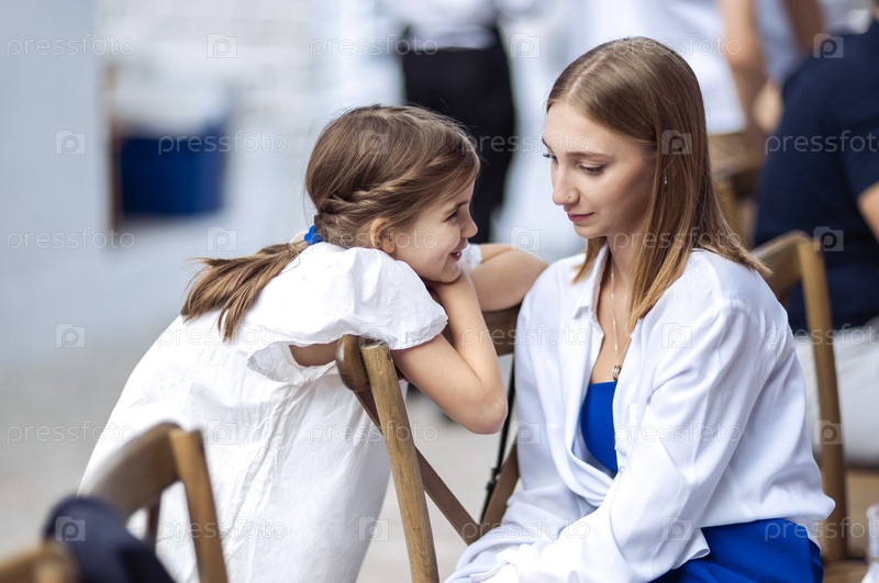 Маленькая девочка в белом платье разговаривает со своей сестрой. Счастливый ребенок и подросток на праздничной встрече. Милые дети улыбаются и болтают вместе
