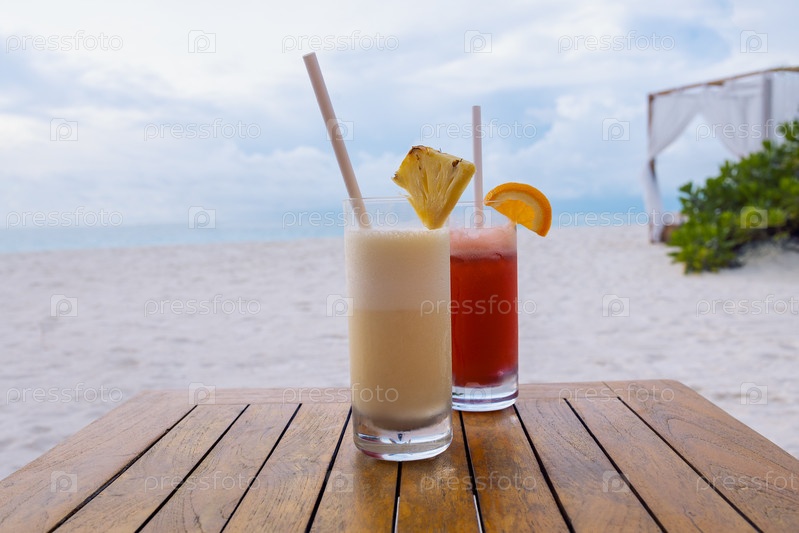 Два восхитительных охлажденных коктейля на деревянном столе на фоне морского пейзажа