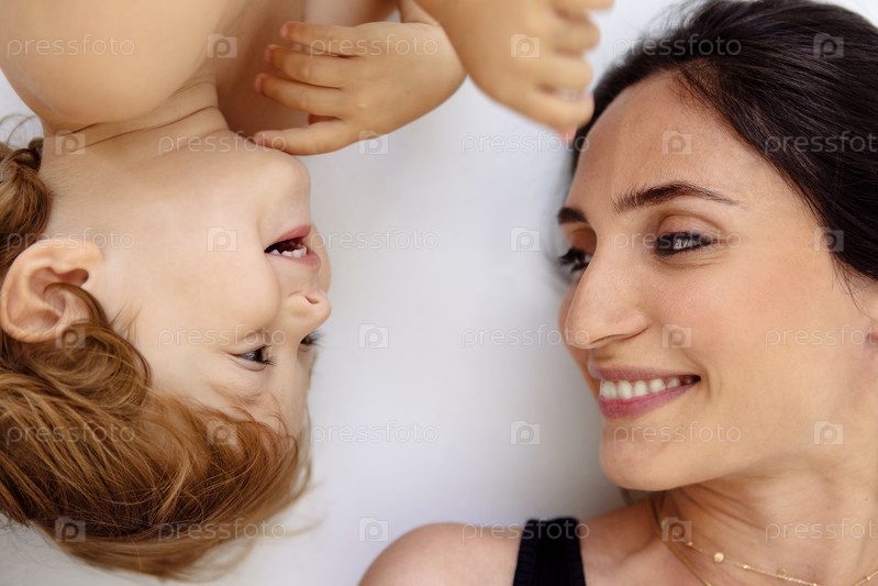Портрет крупным планом в профиль смеющейся матери и милого ребенка. Улыбающаяся женщина и ее маленький сын лежат на белом полу