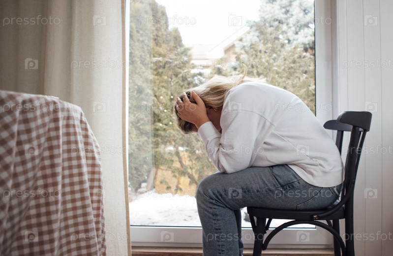 Женщина сидит у окна, обхватив голову руками, олицетворяя момент одиночества и самоанализа