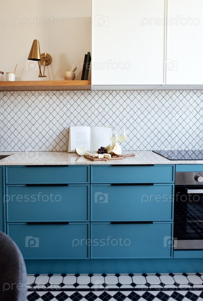 Современная кухня с синим гарнитуром и мраморной столешницей. Деревянные открытые полки с кухонными принадлежностями