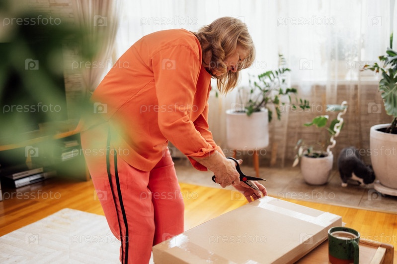 Пожилая женщина в оранжевой повседневной одежде распаковывает посылку. Улыбающаяся дама средних лет открывает картонную коробку в гостиной. Онлайн-шопинг и доставка товаров курьером на дом
