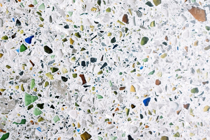 Гранитная текстура с разноцветными камешками. Яркие очки на сером цементном фоне