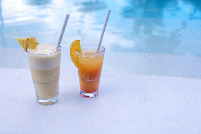 Крупный план двух красочных вкусных коктейлей на краю бассейна. Стаканы с прохладительными напитками и кусочками фруктов возле прозрачной голубой воды