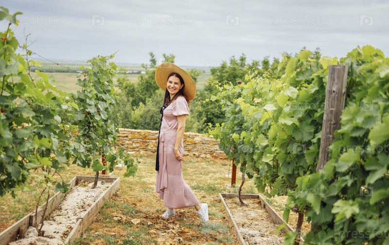 Привлекательная улыбающаяся девушка в элегантном розовом платье прогуливается по винограднику