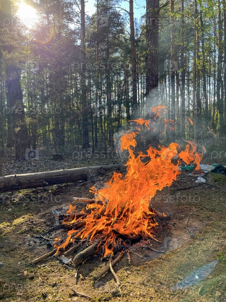 Туристы разожгли костер в лесу на стоянке для отдыха