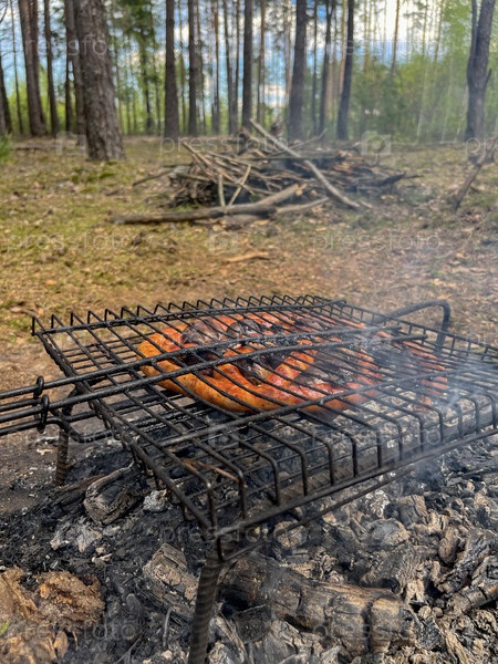 Мясо жарится на гриле в лесу на природе